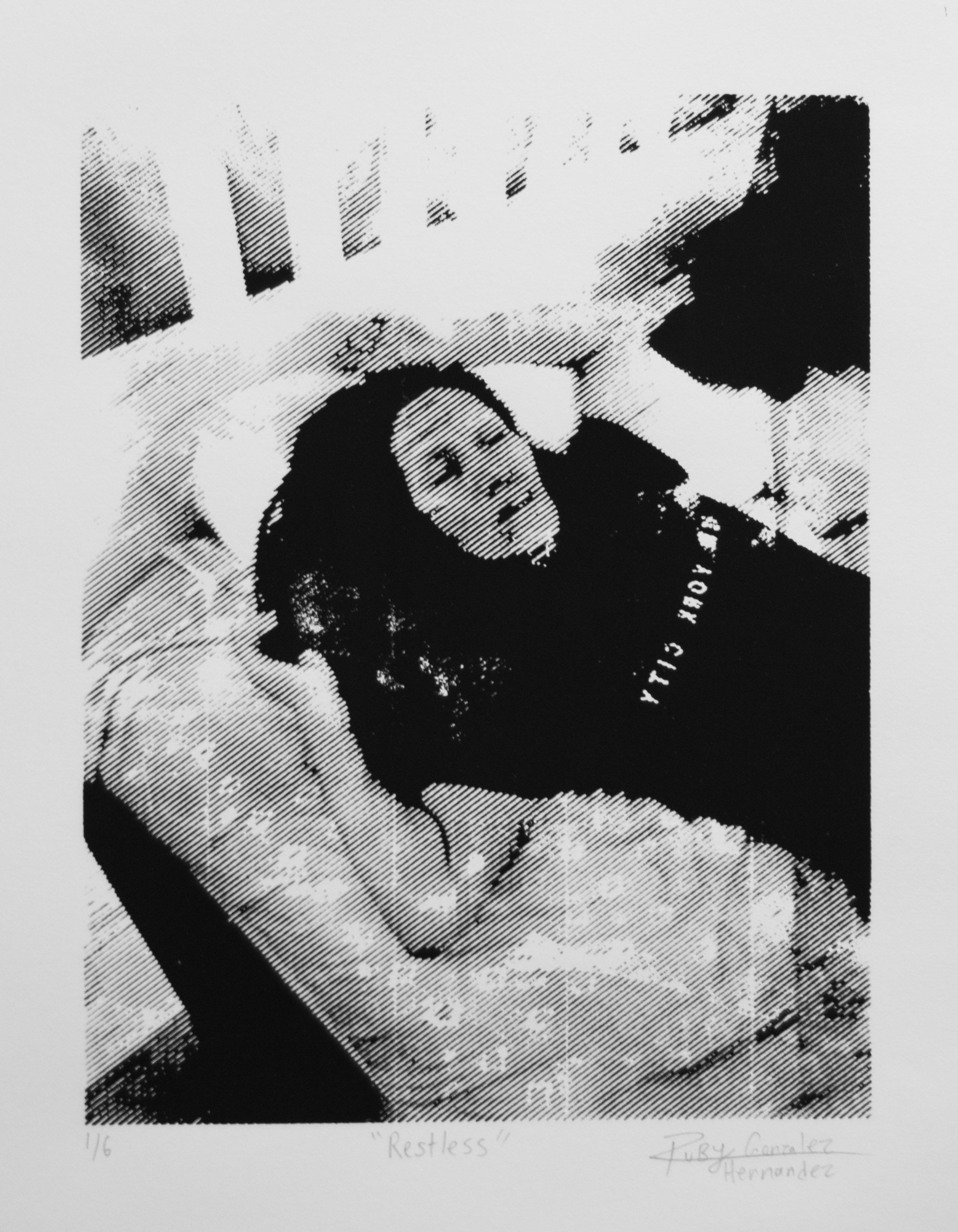 Ruby Gonzalez Hernandez (RGH): This cell phone photo turned woodcut is the first in this series. I call this image the door to “Subseven,” because I wore this dress to my sweet sixteenth birthday party to mark the decision to leave Pentecostalism. This faith is an evangelical Christian religion, whose rules vary slightly by church, but often can include forbidding alcohol/tobacco, any kind of dancing, and most all music, radio, and television in order to gain favor with God. Additionally, for women, this often includes the forbidding of makeup, cutting hair, leadership positions, and immodest dress (wearing pants). At sixteen, I had dedicated ten years as a member of the church with my family, and we (being my mother, brother, and previously, father) held pretty high positions within that community. As much as I wanted to leave quietly, it wasn’t going to happen. When I began creating these photographs, years after my departure from this faith, it solidified that though I was undoubtedly relying on intuition, inexplicable at times, I was yearning to speak to someone I once was. In a way, trying to work through finding answers to questions I hadn’t completely understood yet.